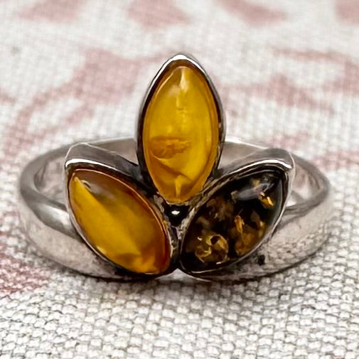 This unique ring features a trio of marquise-cut Baltic amber stones, arranged in a leaf-inspired design. Each amber gem has its own vibe – golden honey, rich cognac, and deep mossy green – giving the piece a beautiful natural contrast.