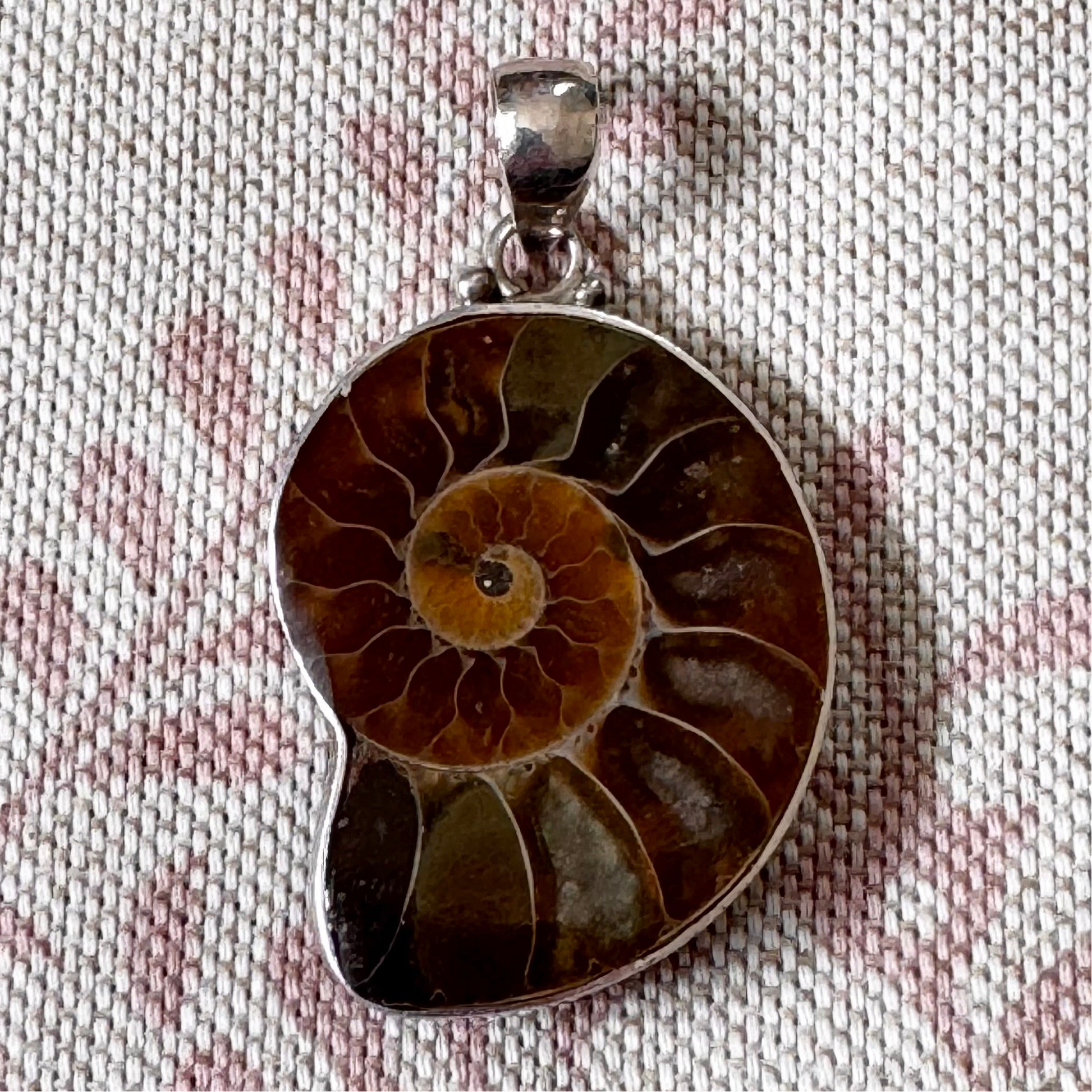 A naturally beautiful ammonite fossil pendant, shaped over millions of years and polished to bring out those classic spiral patterns. It’s got that earthy, ancient vibe without being too flashy – ideal if you like your jewellery with a bit of character and history.