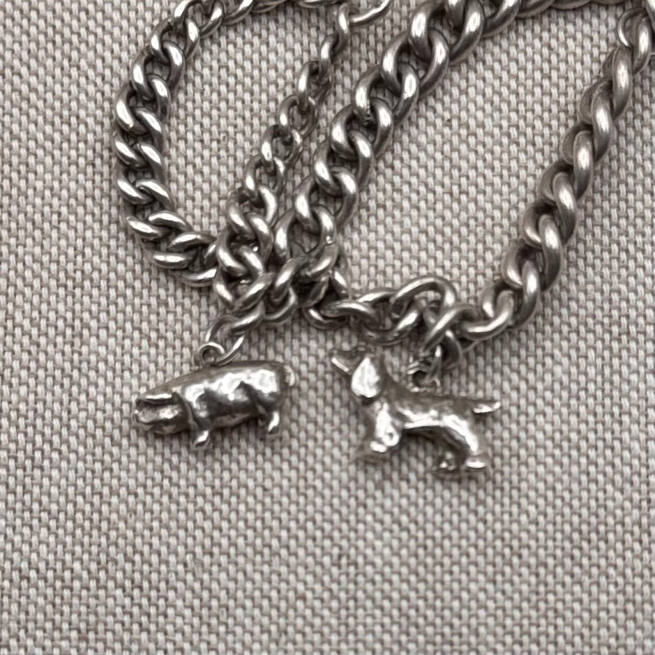 This delightful antique charm bracelet features a double row of sterling silver chains, with two figures — a dog and a pig. Fully hallmarked for Chester 1907, each link bears the lion passant, confirming its sterling silver purity.
