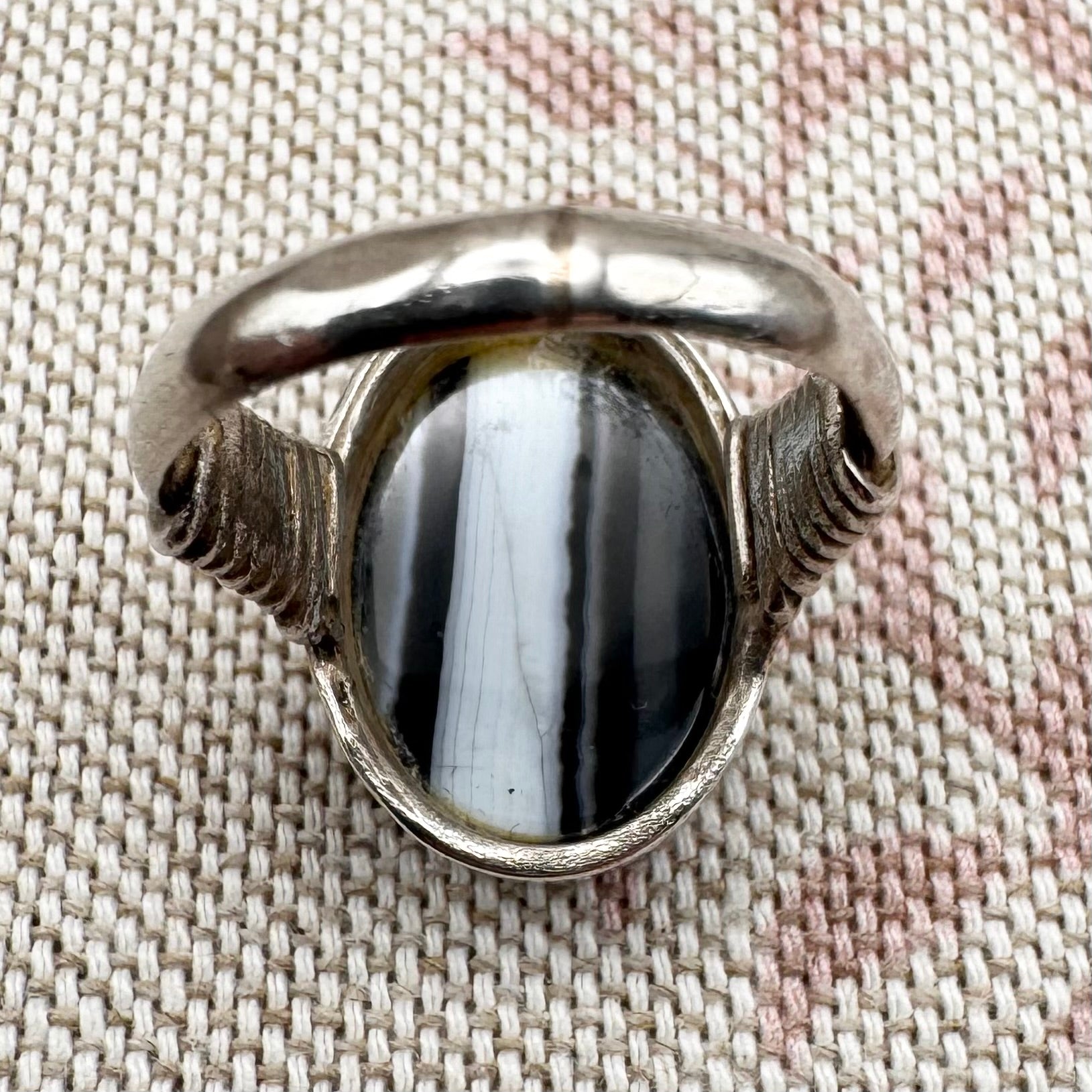 Black Botswana agate silver ring with coiled shoulders, size G.5 (US 3.5)