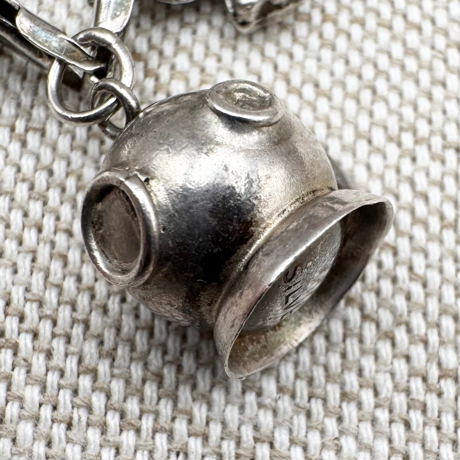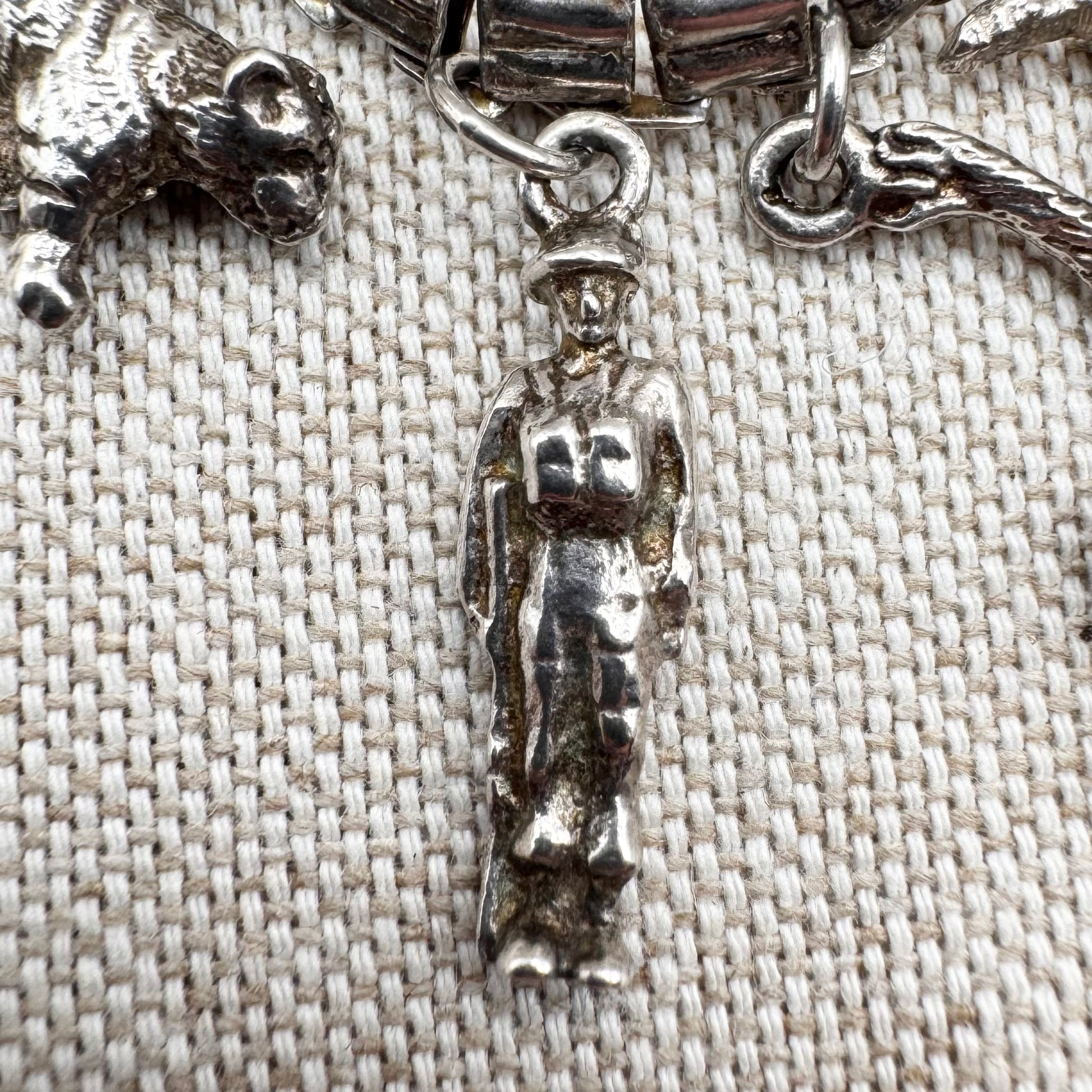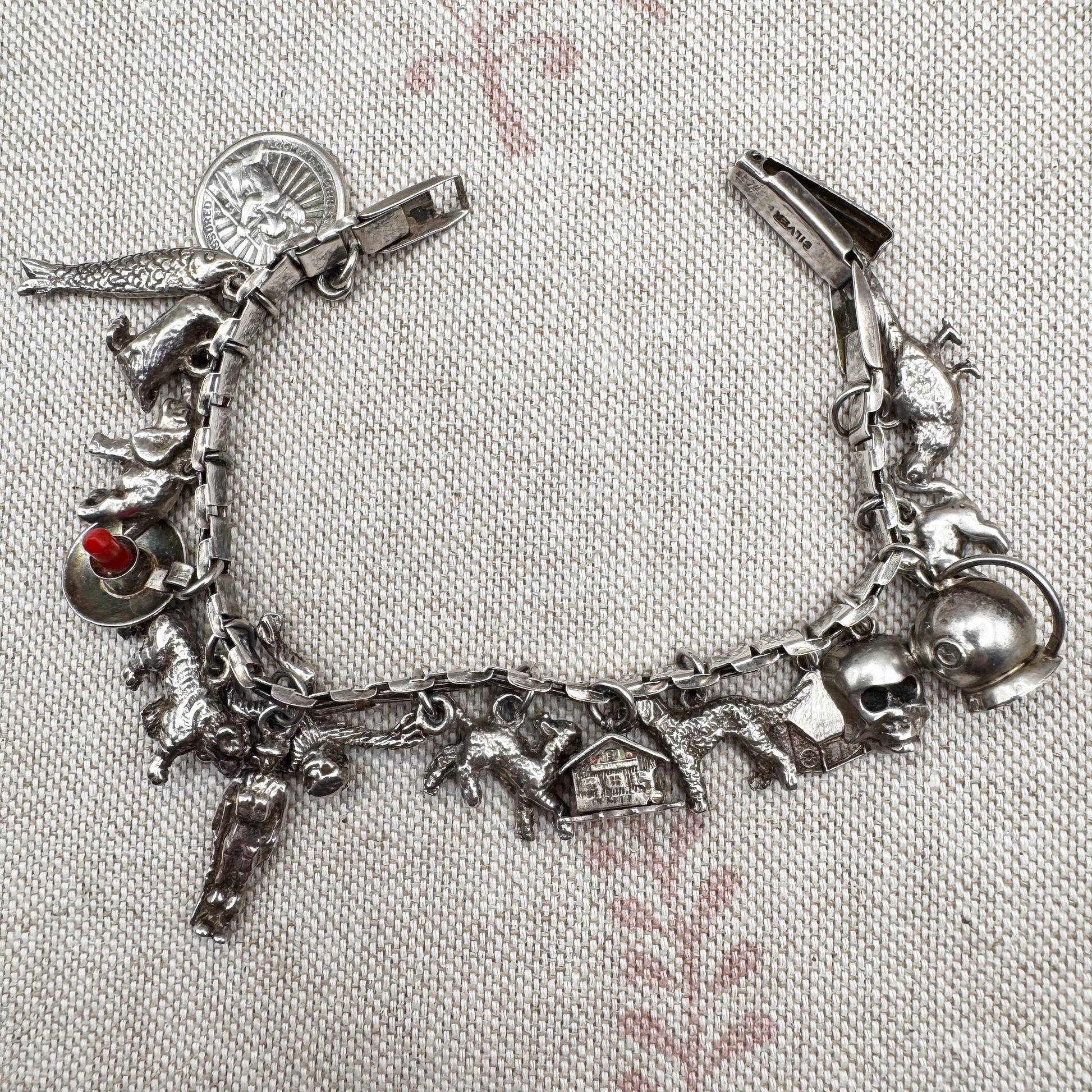 This vintage silver bracelet has an easy, nostalgic charm about it. The links are hung with a mix of tiny silver keepsakes that jingle lightly as you move, giving the piece a sense of life and playfulness. It’s the sort of bracelet that feels like it’s carried stories with it, the kind you can imagine being added to over the years. A little treasure in its own right.