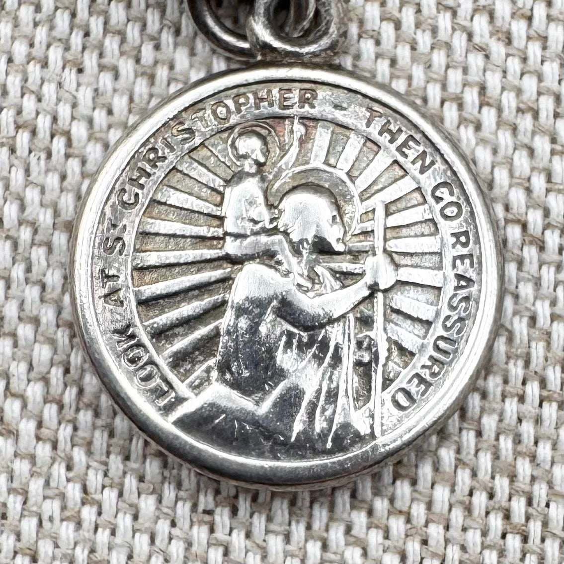 Stamped 'STERLING' on the St Christopher charm, 'SILVER' on the candlestick and diving helmet charms, and 'COCKINGTON HG&S SILVER' on the hut charm. Also stamped 'SILVER' on the bracelet clasp.
