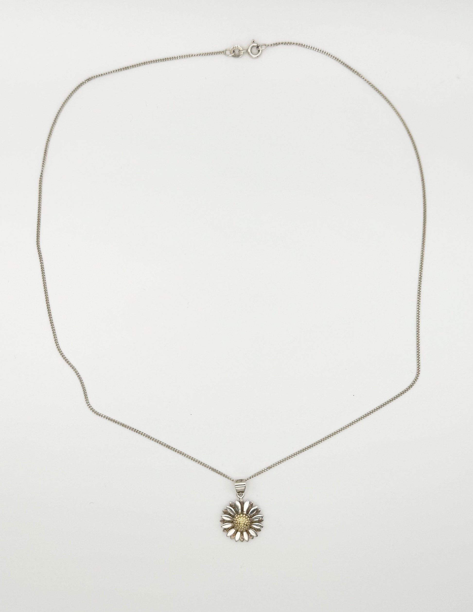 Centre of flower is gold coloured. Pendant and chain together measure about 10” drop around neck. Stamped ‘925’.