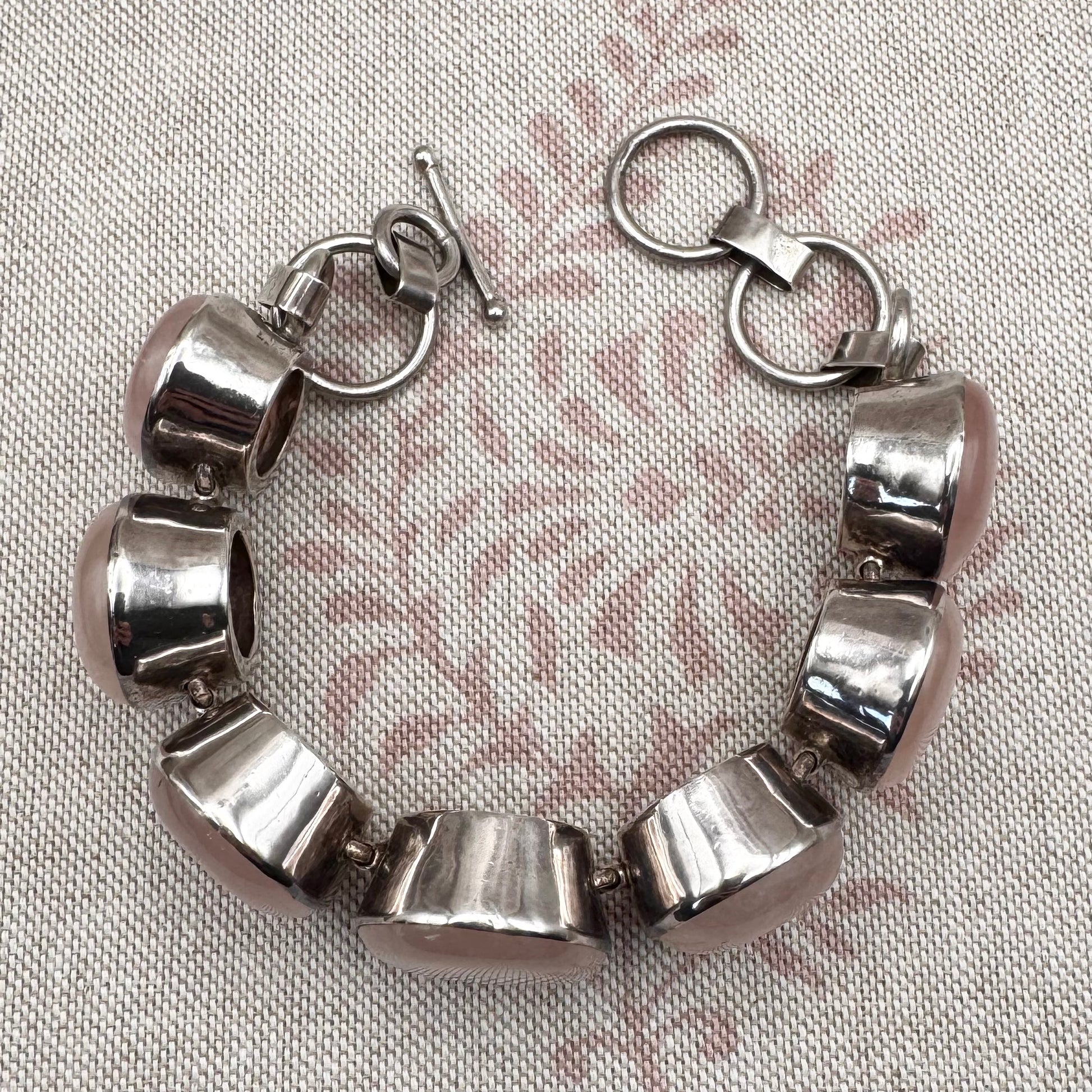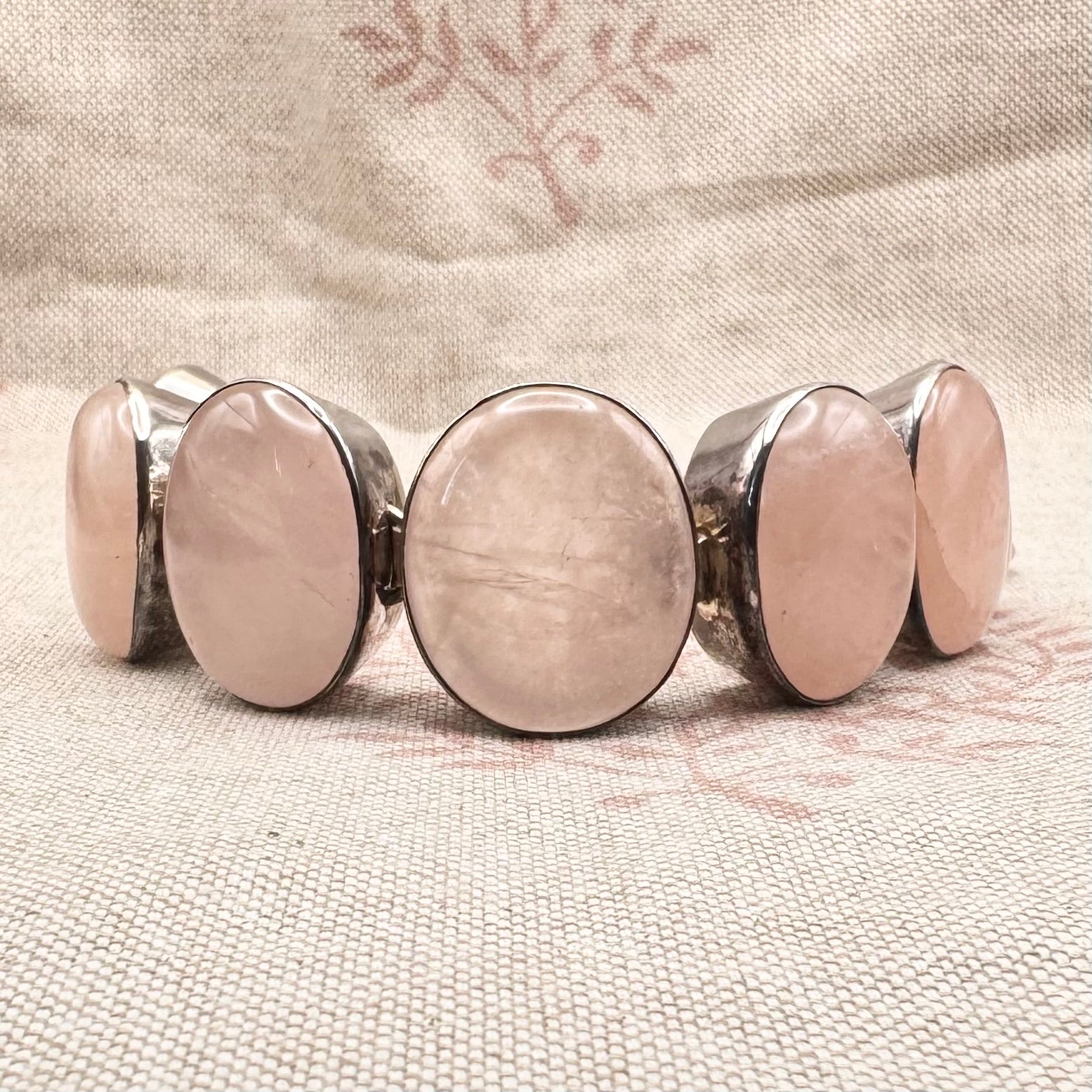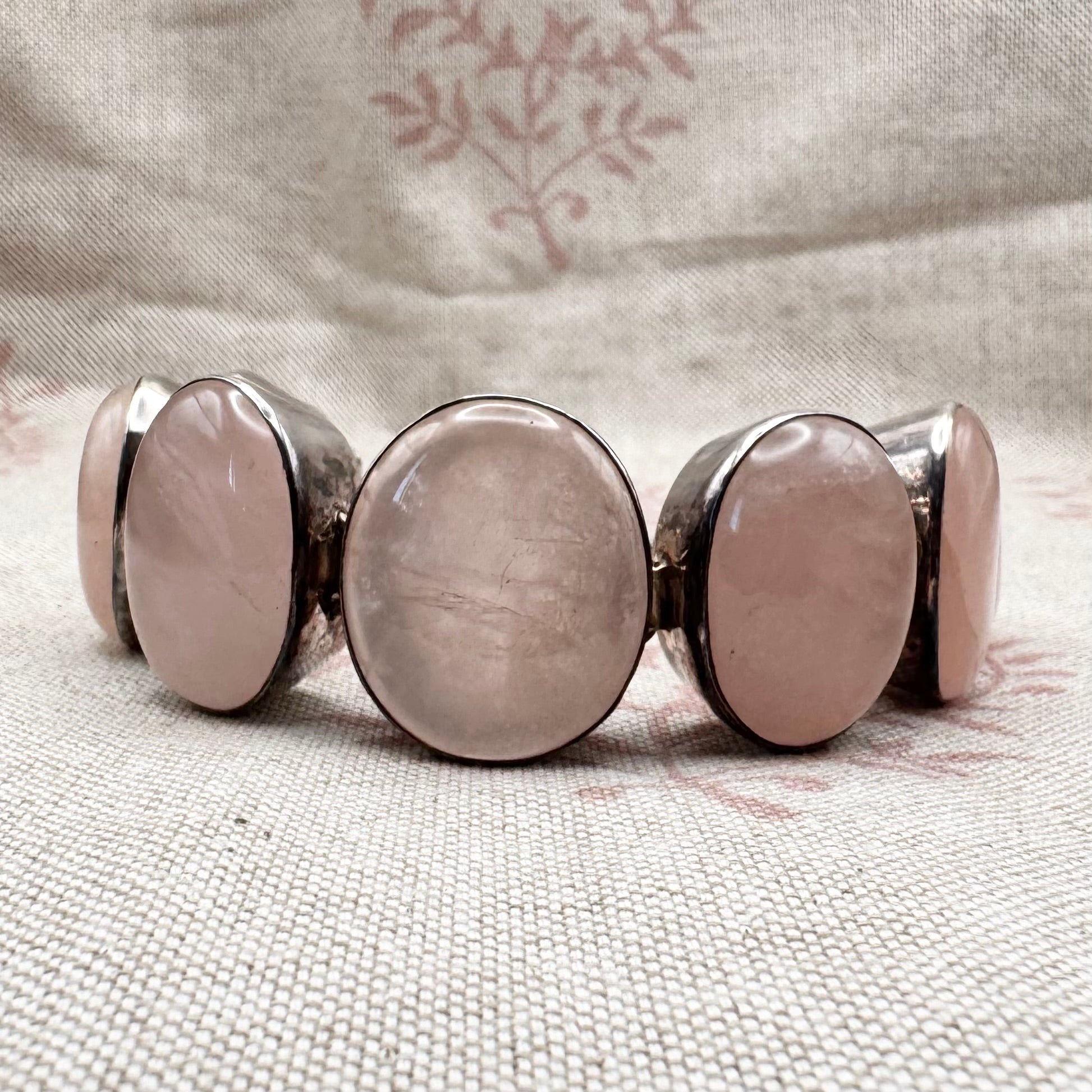 This chunky handmade bracelet is set with a series of oval rose quartz cabochons, each individually mounted and linked to form a continuous articulated design. The stones display soft, translucent pink tones with natural internal variations.