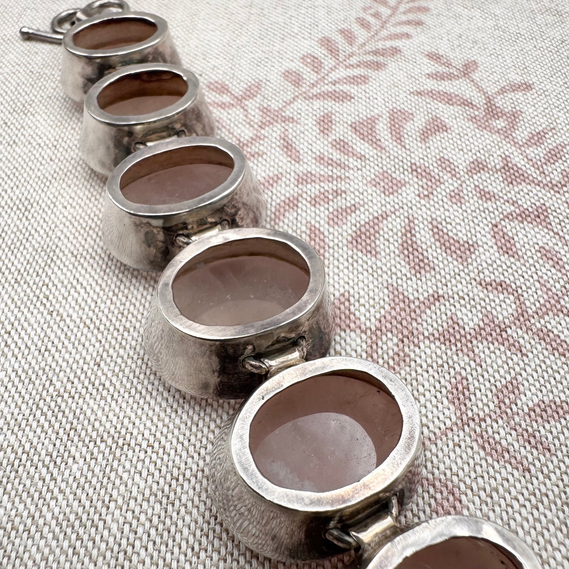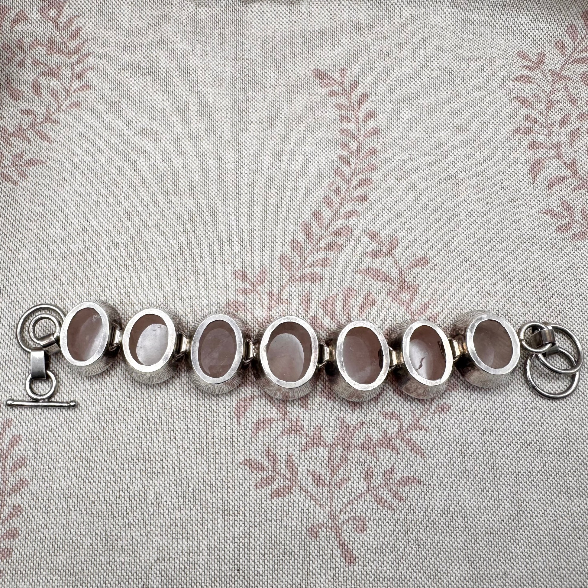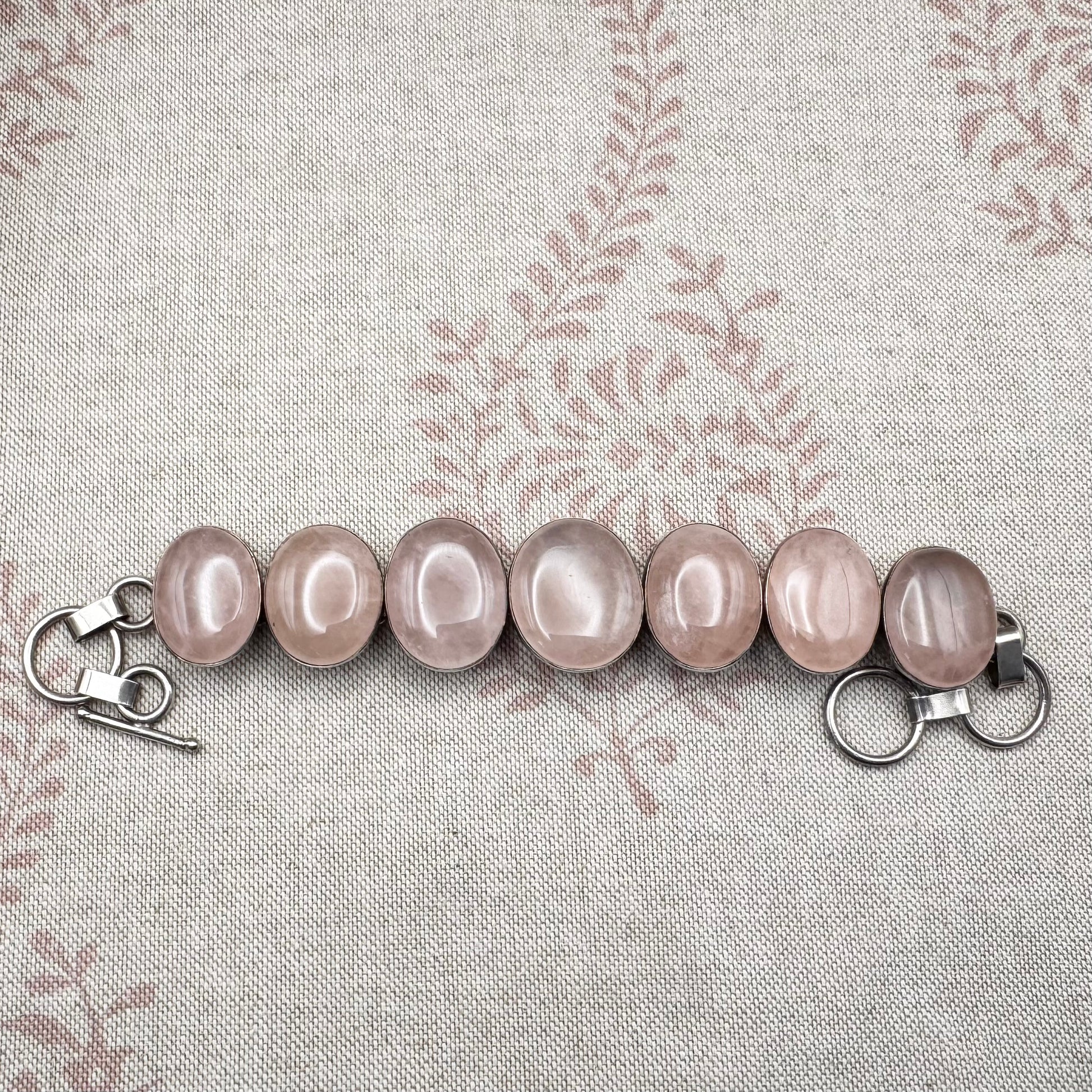 This chunky handmade bracelet is set with a series of oval rose quartz cabochons, each individually mounted and linked to form a continuous articulated design. The stones display soft, translucent pink tones with natural internal variations.