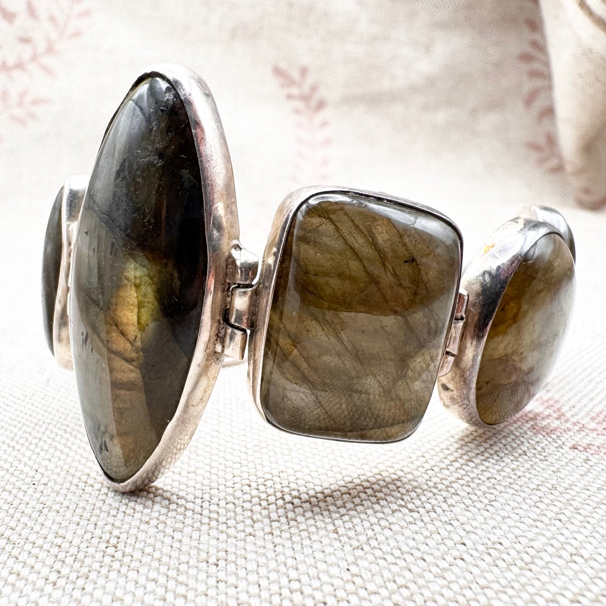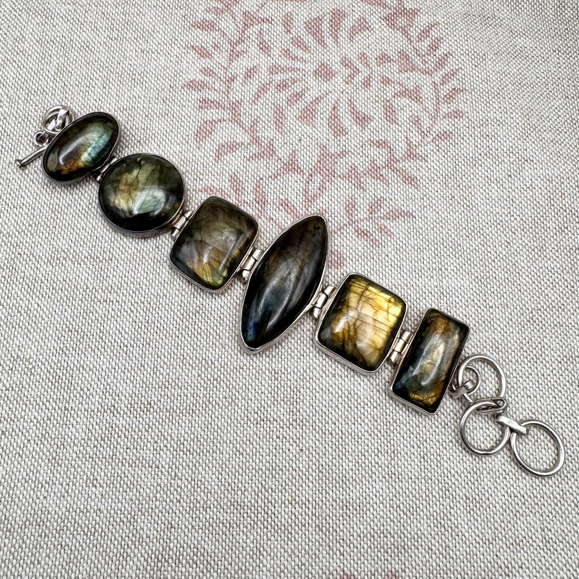 Single row of 6 labradorite stones. Length, including chain, 7.5”. Weighs 44.6g.