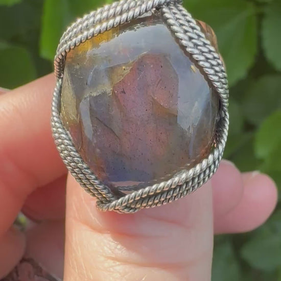 The unique design of this ring enhances the natural beauty of the labradorite stone, allowing its vibrant colours to shine from every angle.