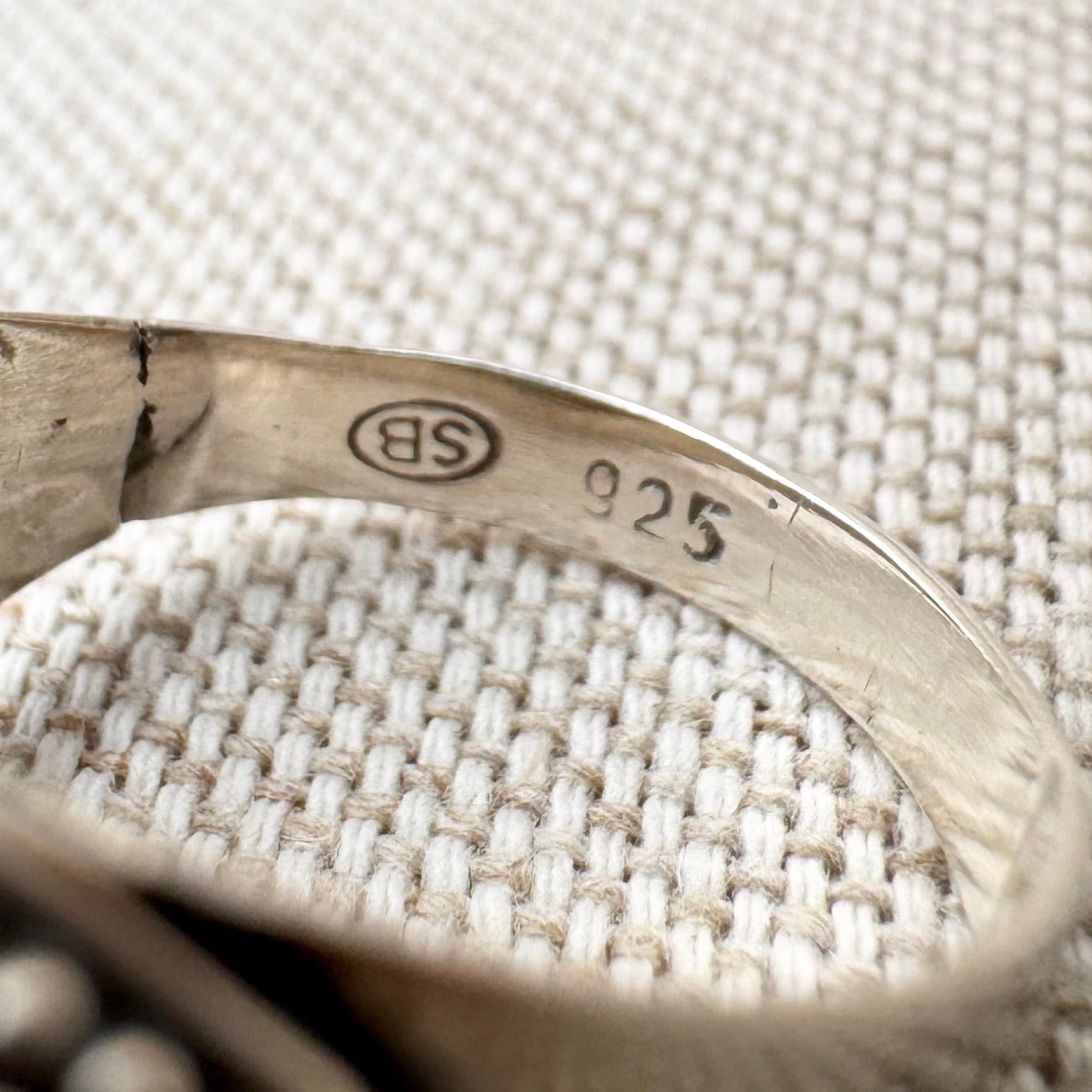 Striking silver ring set with a large, faceted labradorite gemstone. The stone displays beautiful flashes of gold, green, and blue as it catches the light, with a lovely depth of colour unique to labradorite. Framed in an intricate claw and rope‑detail bezel.