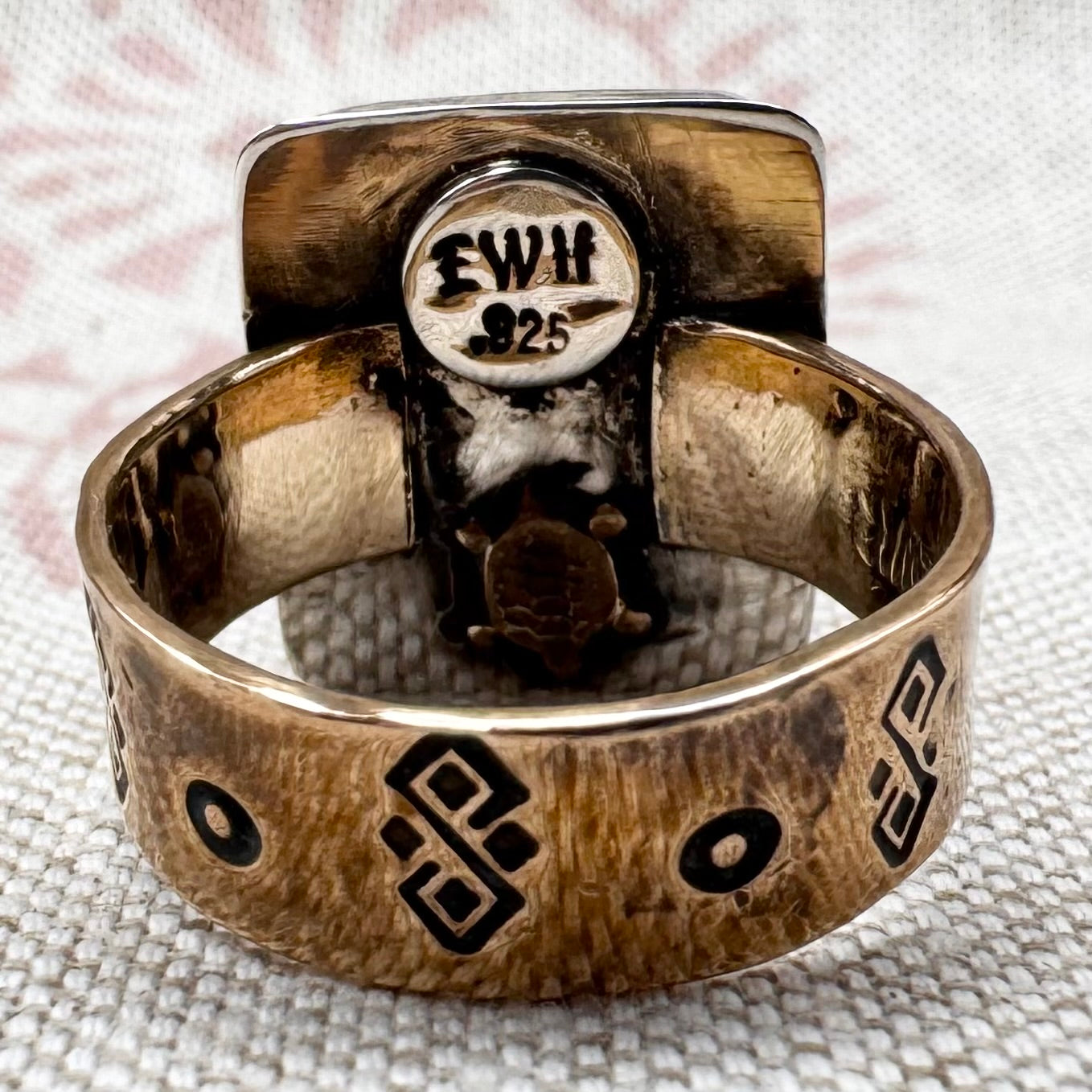 A bold statement ring featuring a large square turquoise stone set in a smooth silver bezel, framed by a softly wavy border that adds a touch of movement and texture. The band is silver gilt, decorated with a subtle geometric pattern that catches the light beautifully.