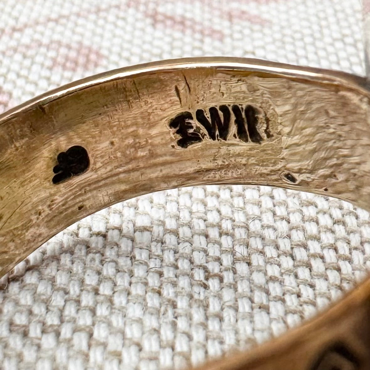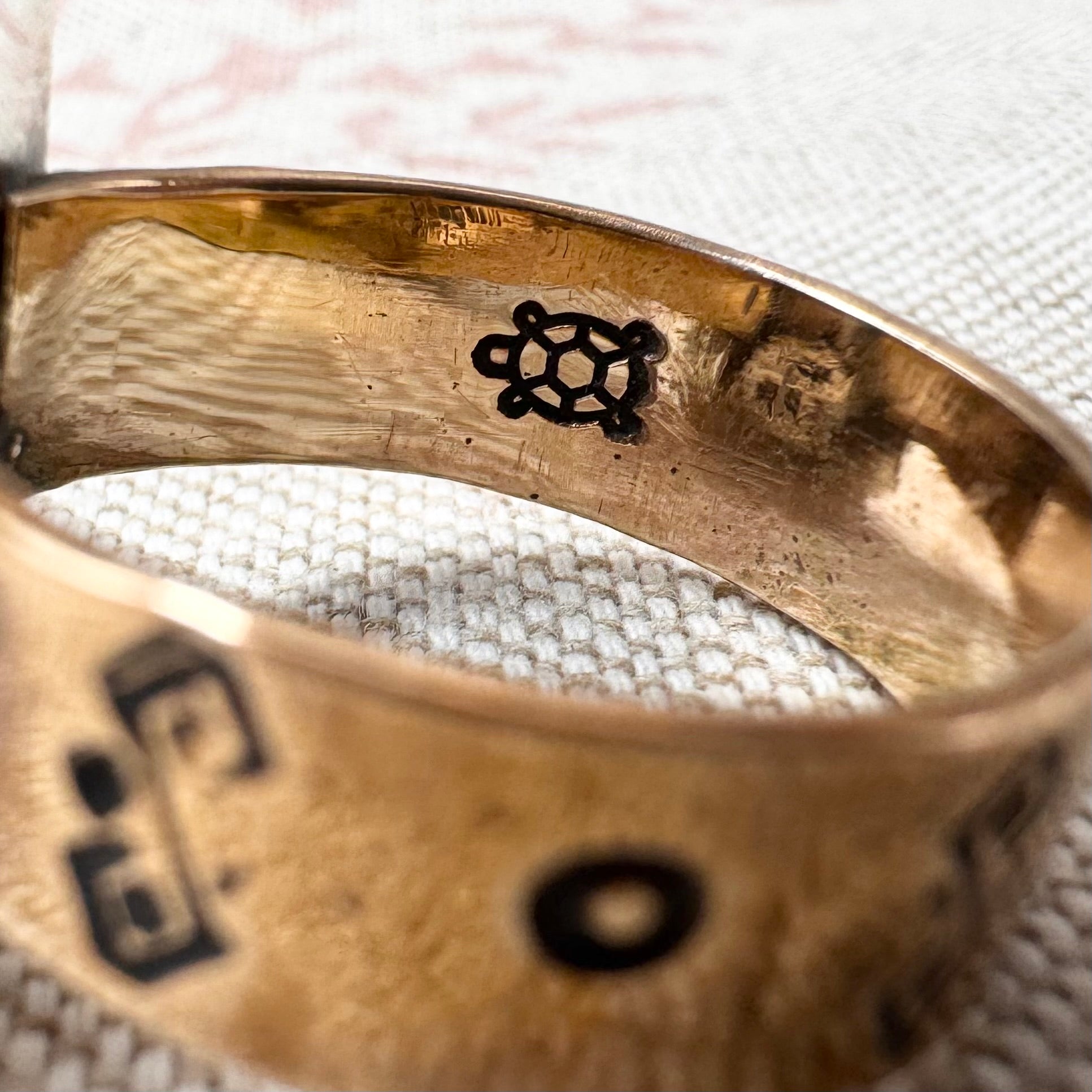 The band is stamped 'GF', 'EWlf' and a turtle symbol. Two plaques have been added to base of the bezel - one with 'Elf .925' and a turtle symbol.