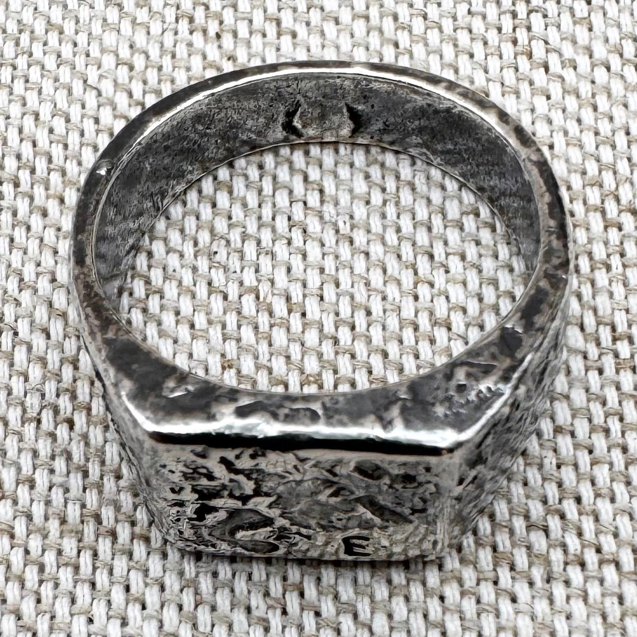 A distinctive signet ring with a soft, molten texture that flows naturally around the band and face. The surface has an almost liquid feel — as though the metal has settled into its own shape — giving it a raw, organic character. In the bottom right corner of the face, the letter ‘E’ is finely engraved, a subtle detail that adds a touch of individuality.