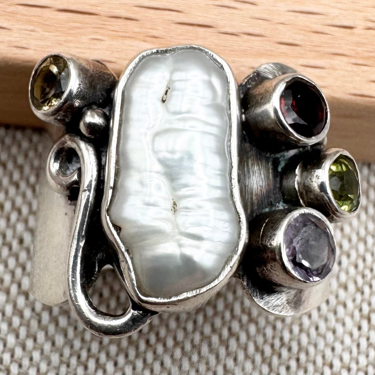 Contemporary statement ring with baroque pearl and gemstone accents, size M/6