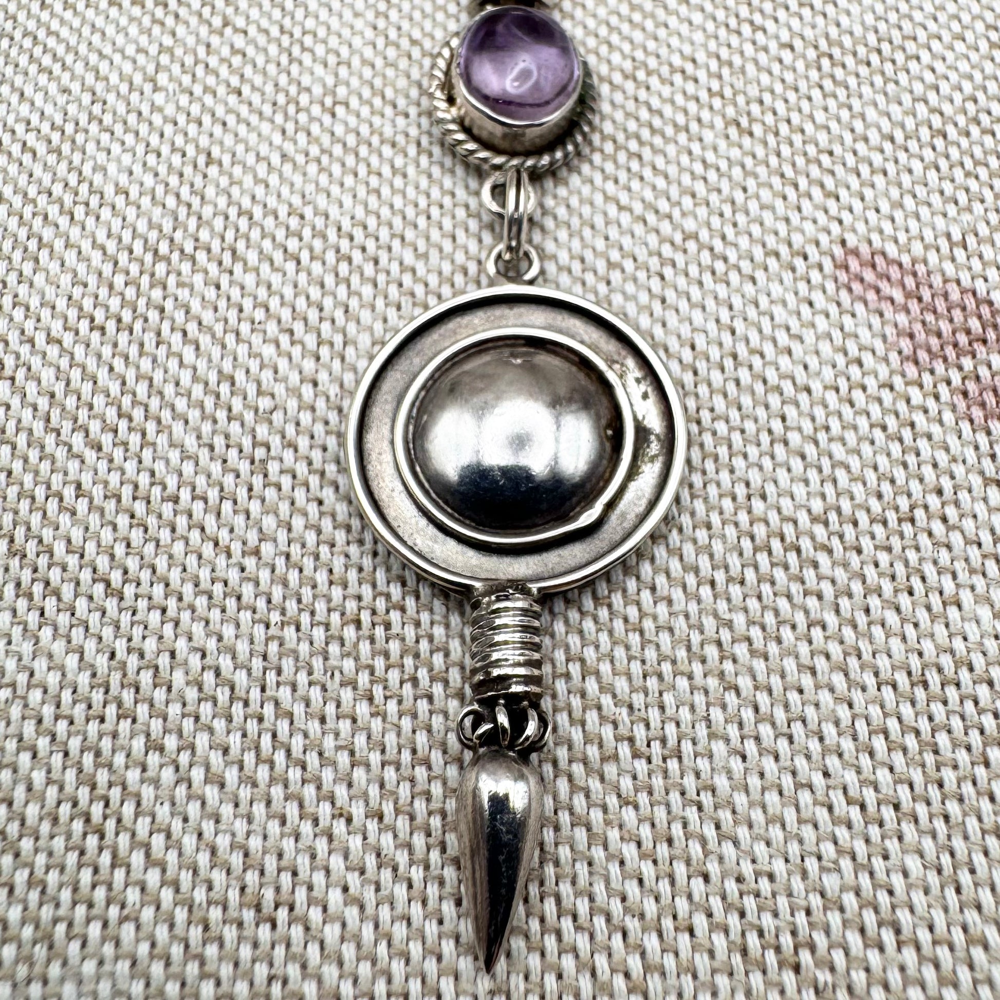 A beautiful silver pendant featuring two oval amethyst cabochons linked by a smooth silver connector. The design combines polished silver domes with soft purple tones and finishes in a pointed drop, giving the piece a sculptural, balanced look.
