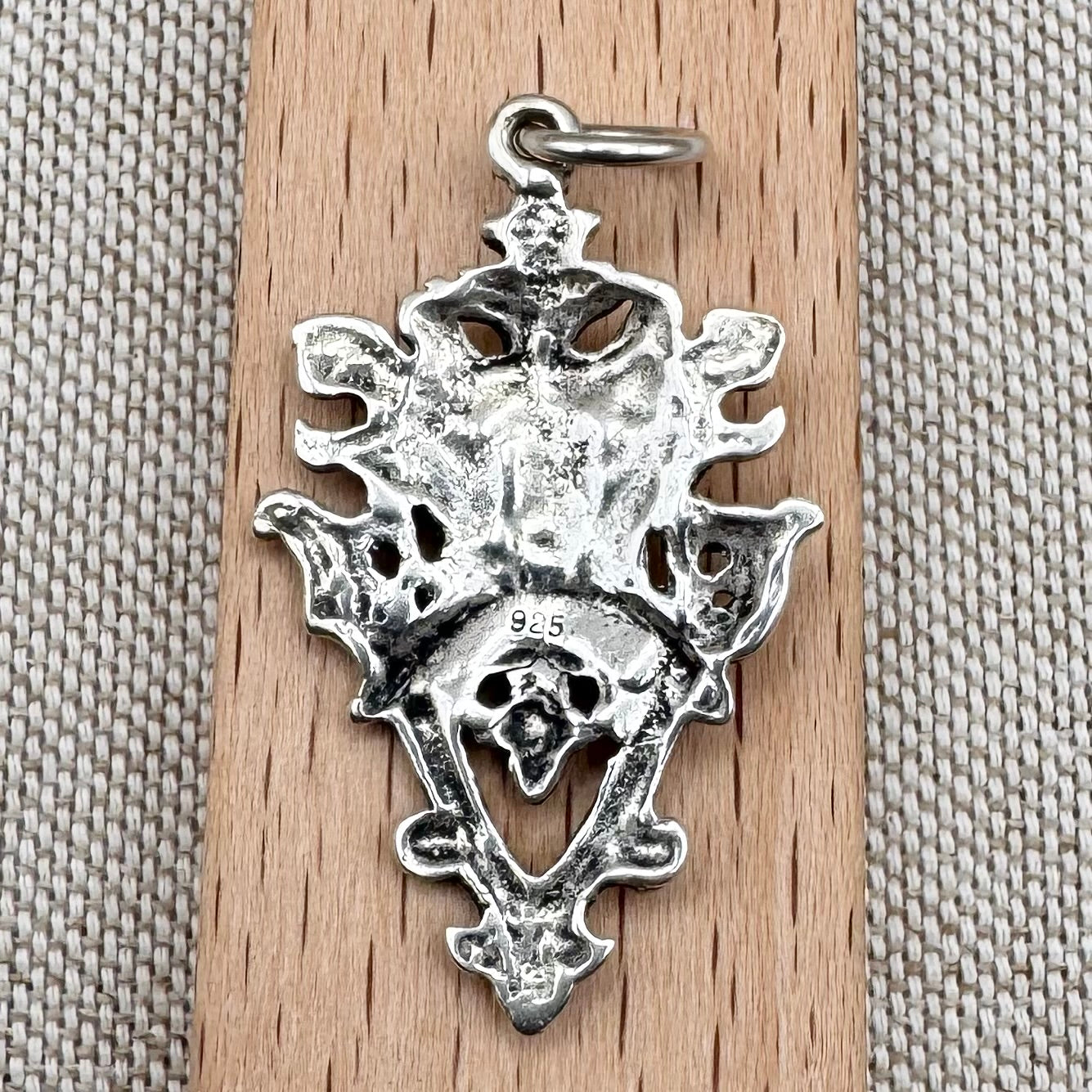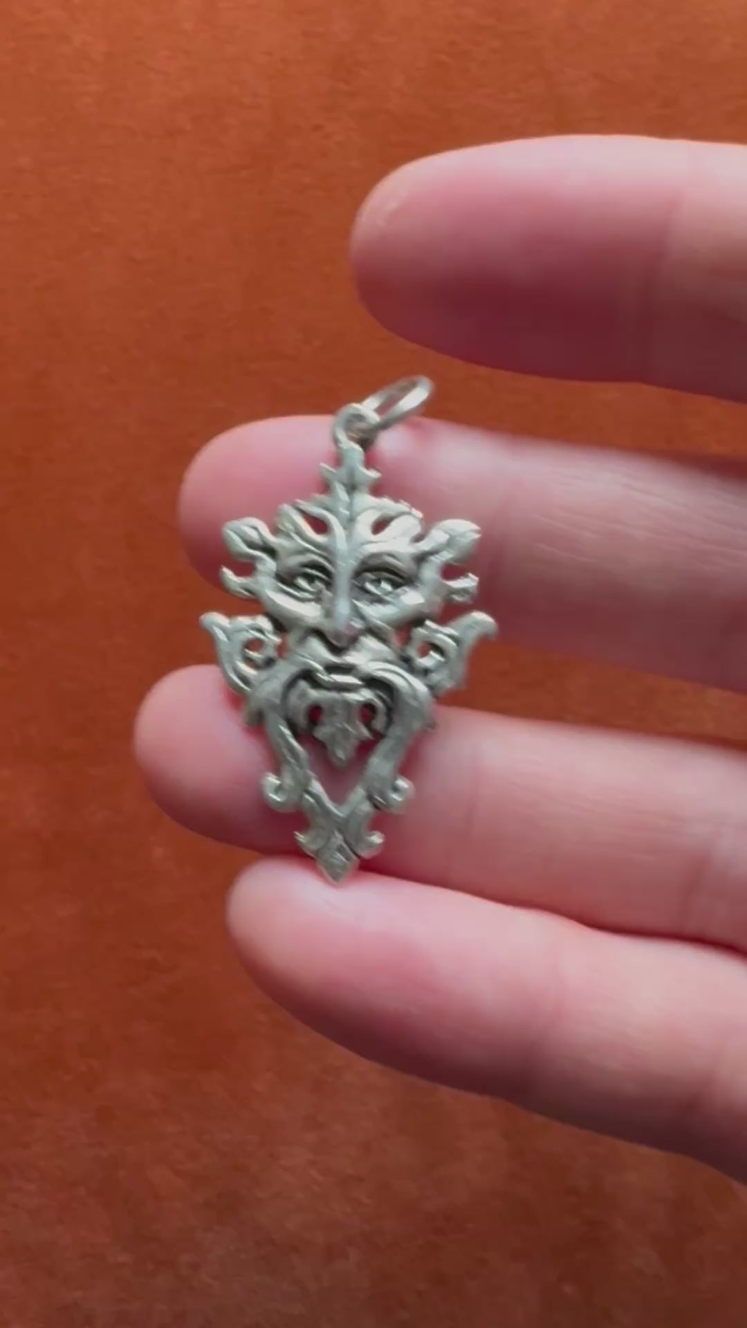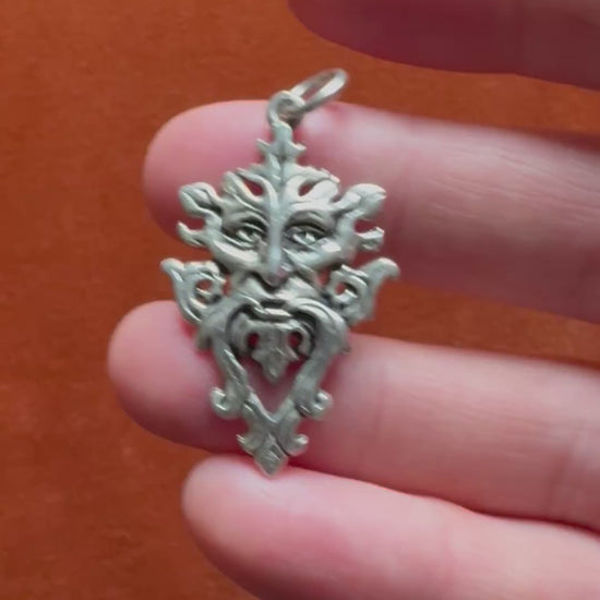 A silver pendant depicting the Greenman, a foliate face formed from curling leaves and tendrils. The Greenman is a symbol with deep roots in European art and folklore, often interpreted as a representation of renewal, fertility, and the interconnection between humanity and nature. Found in medieval church carvings and later revived by the Arts and Crafts and Gothic Revival movements, the motif continues to embody the enduring cycle of growth and rebirth.