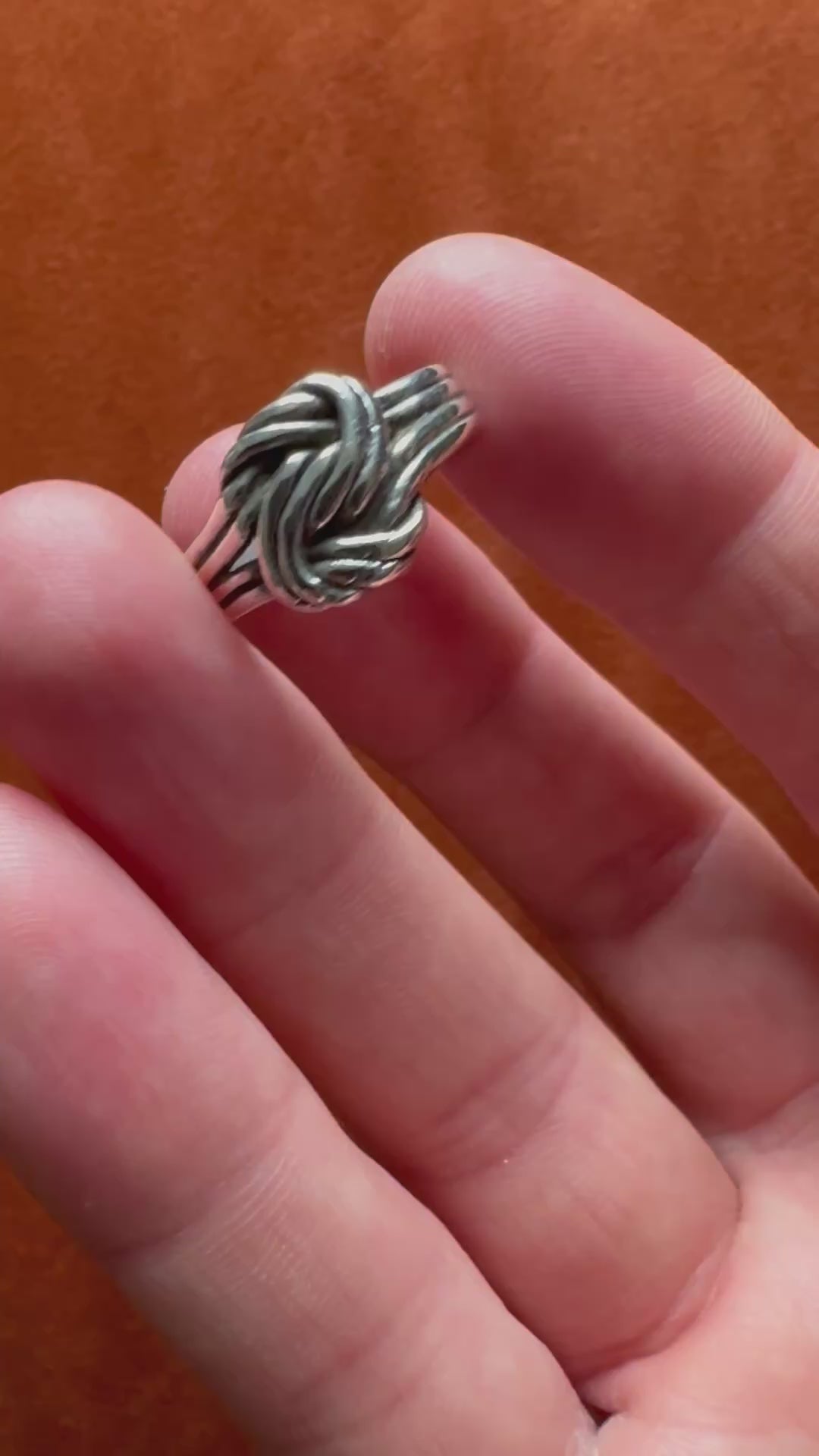 A vintage silver ring featuring an intricate knot design formed from multiple interwoven strands. Fully hallmarked for London 1974, the design draws on long-standing symbolic traditions of knot jewellery, often associated with unity, connection, and continuity. Also stamped 'silver' and the maker's mark 'JS&Co.'