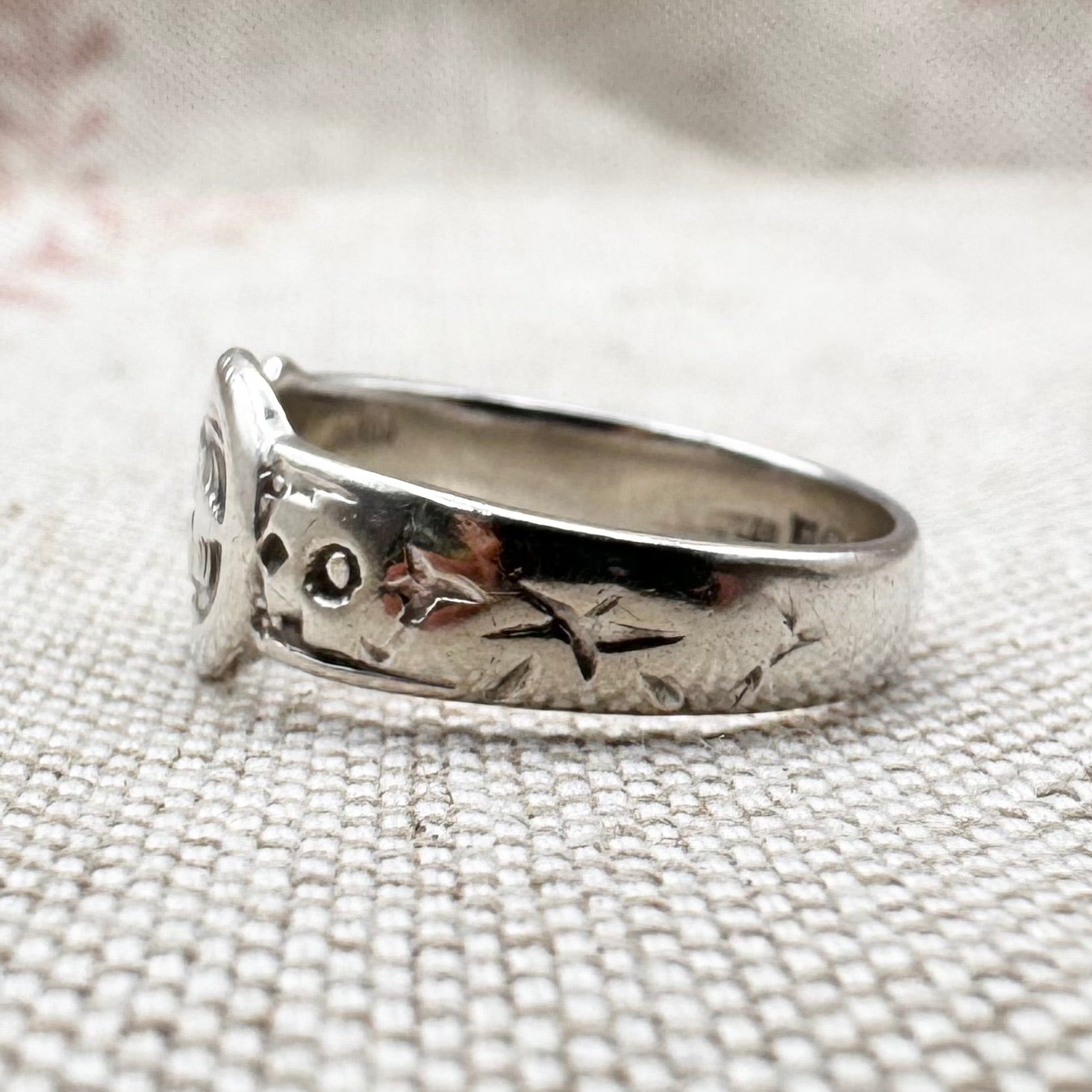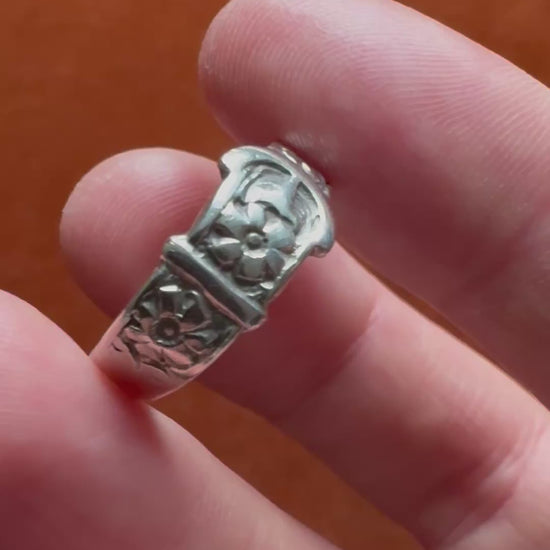 A beautiful silver buckle ring decorated with a repeating floral motif. The design features raised flowers with engraved detailing along the band, leading into a small sculpted buckle front. Inside the band are hallmarks for Birmingham 1977 and the maker’s mark LTD.
