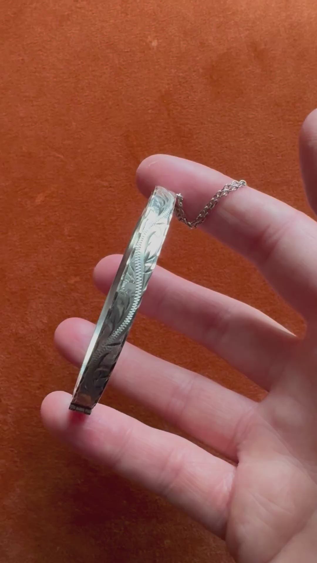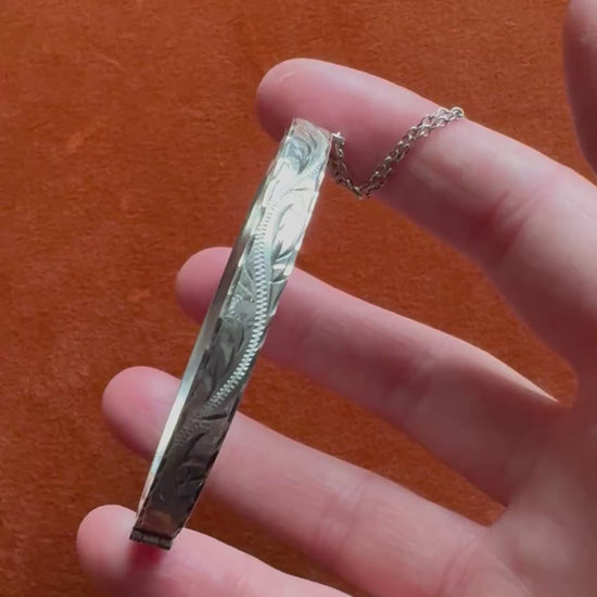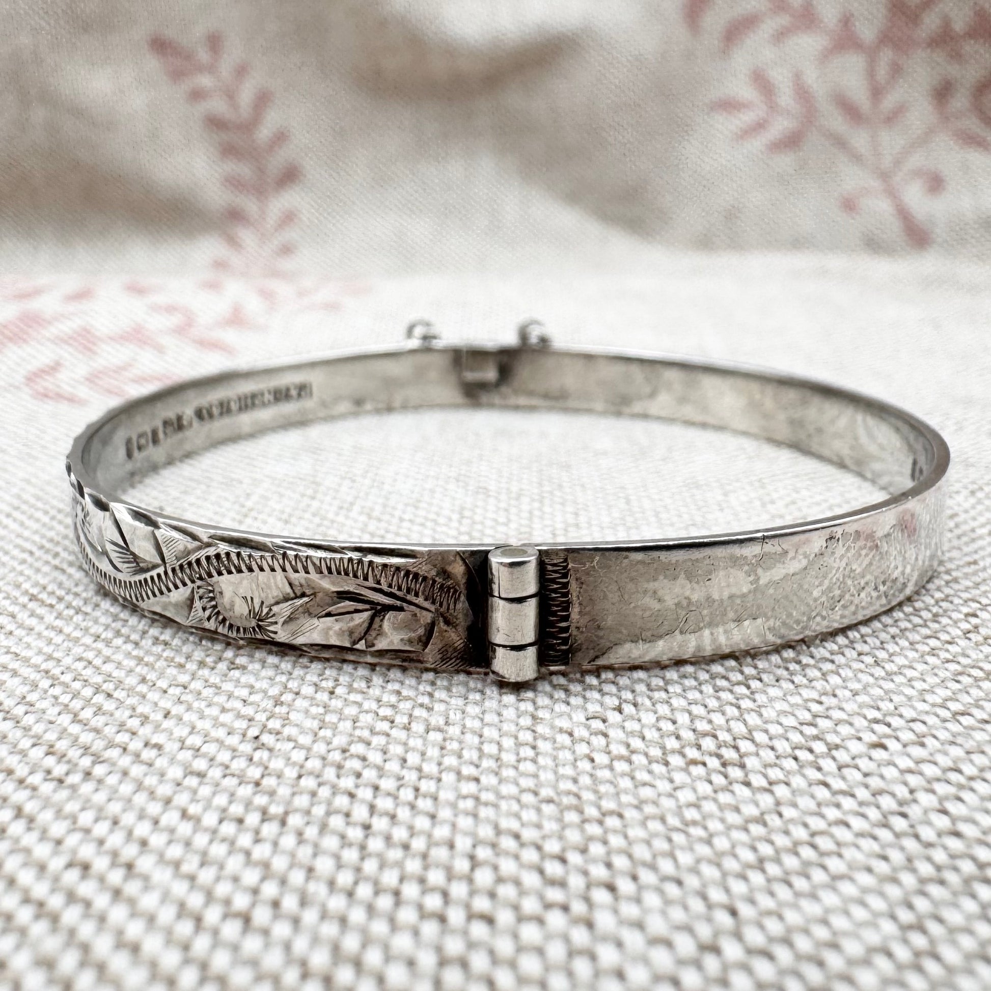 A vintage sterling silver bangle by Bracelon Ltd, hallmarked for Birmingham 1990. The design features a finely engraved foliate and zigzag pattern running along the front. The bangle closes with a concealed clasp and safety chain for security, and bears a patent number (PAT. No. 1167637) that incorporates the maker’s mark.