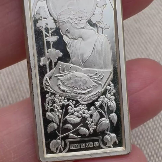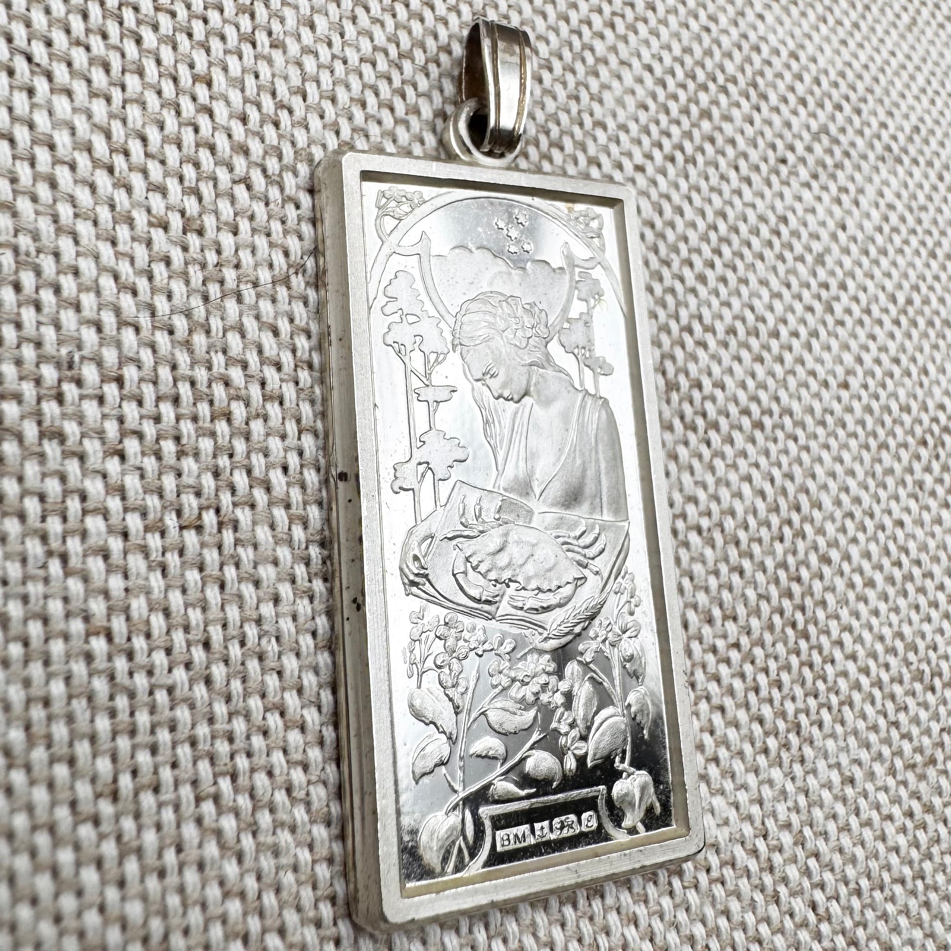 A beautifully detailed silver pendant inspired by the flowing Art Nouveau style of Alphonse Mucha. It depicts the Cancer zodiac sign — a serene figure holding a crab, surrounded by soft floral and celestial motifs. Hallmarked for Birmingham 1979 and produced by the Birmingham Mint. A real collector's piece and not easy to come by!